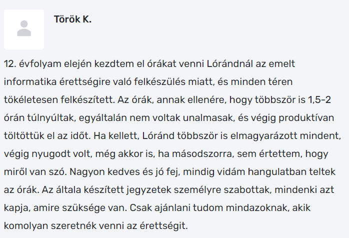 Szívesen segítek kockafej dolgokban, informatika érettségi felkészítésben, közép- és emelt szinten is egyaránt. Több éve vagyok óraadó tanár két budapesti gimnáziumban, így tudom mik az anyag fontos és érdekes részei. 🙂